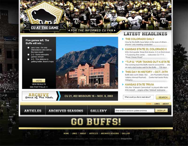 Complete site re-design and development for this CU Football fan site. Migration of large archive of existing articles to the new site.