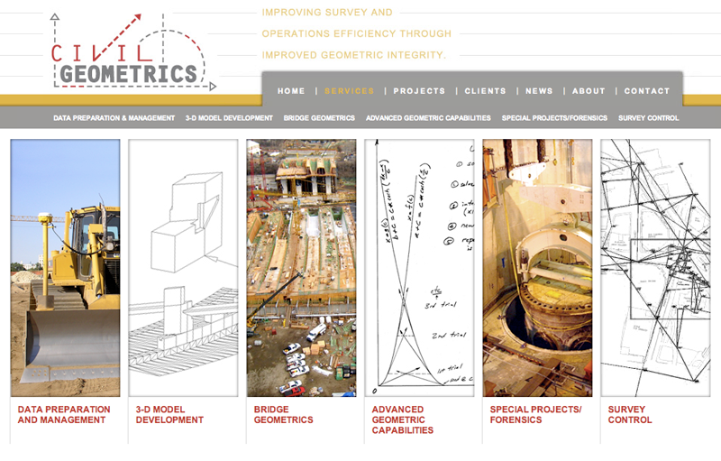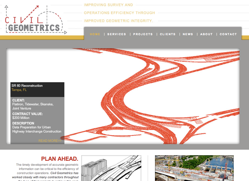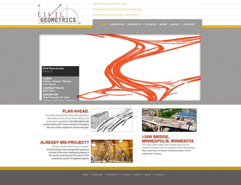 Custom design and develpoment to showcase the expertise of Civil Geometrics and their many large projects.