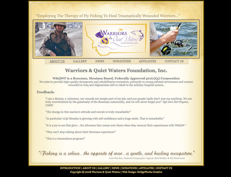 Warriors and Quiet Waters helps heal traumatically wounded servicemen and women through the therapeutic nature of fly fishing. BridgeWorks donated time and skills in both design and development to create a web presence for this great cause.